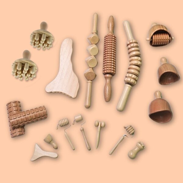 - Kit Maderoterapia corporal contiene 6 elementos.