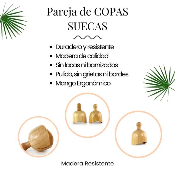 La pareja de Copas Suecas es la herramienta indispensable para cualquier Maderoterapeuta profesional que busque resultados visibles desde la primera sesión. Diseñada para generar un efecto de succión que moviliza la grasa localizada, drena líquidos y eleva glúteos sin dañar el tejido.