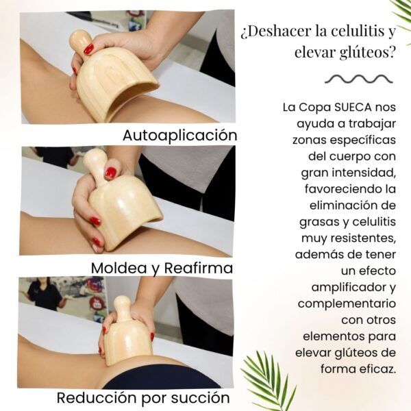 Si tus clientas vienen buscando reducir abdomen, definir cintura o elevar glúteos, la Copa Sueca es tu herramienta maestra. No es un simple accesorio de madera; es la clave para realizar un vacío controlado que desplaza los adipocitos hacia los ganglios linfáticos de forma precisa.